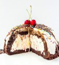 For the ice cream: Whip 1½ cups cream until stiff peaks form and fold in sweetened condensed milk and sprinkles if desired. Pour into your brownie-coated bowl until the ice cream mixture almost reaches the rim of the brownies (see photo below). Freeze solid.