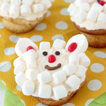 So today I’m bringing you these adorable little lamb cupcakes! They are so easy and you don’t even have to be good at piping. Just a schmear (yes, schmear) of frosting over the cupcake, plunk on some mini marshmallows, and make the face.