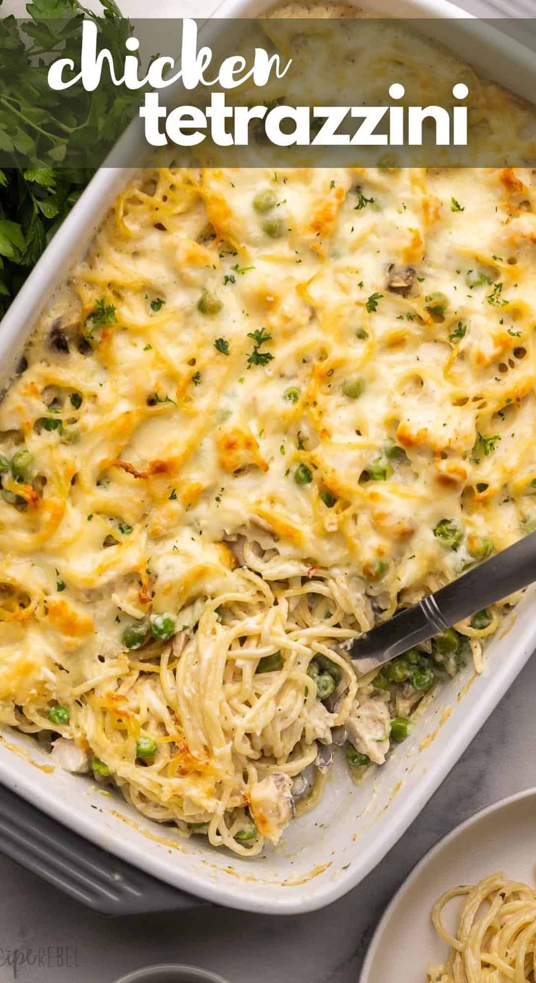 This Chicken Tetrazzini recipe is a classic comfort food made with chicken and pasta and bathed in a creamy sauce with mushrooms and peas.