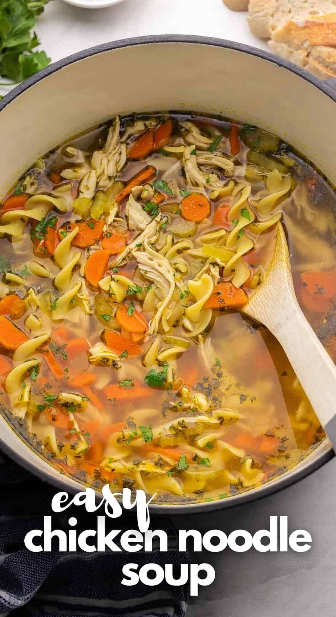 This homemade Chicken Noodle Soup is loaded with tender vegetables, shredded chicken, and egg noodles simmered in a delicious broth! It’s the perfect hearty, healthy dinner for any night of the week.