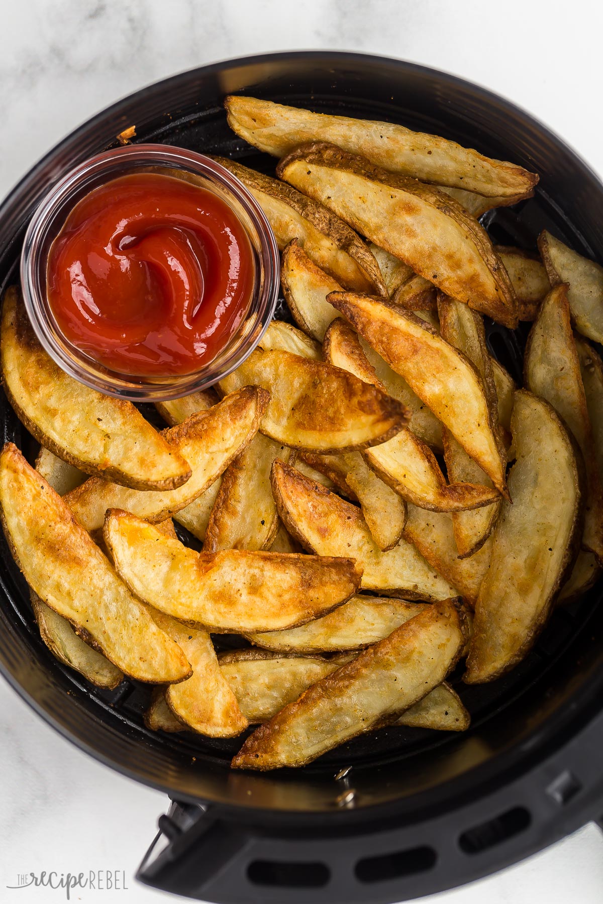 Place potatoes in the air fryer in a single layer for even cooking! If the air fryer basket is too crowded, some parts of the wedges may be overcooked or undercooked. You may have to do a few batches!