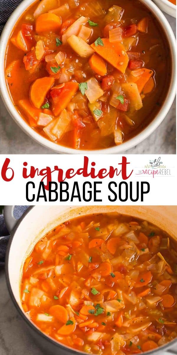 This easy Cabbage Soup is a healthy soup recipe made with just SIX ingredients, including cabbage, carrots, onions, celery, and tomatoes. Dairy free, vegetarian, gluten free and DELICIOUS.