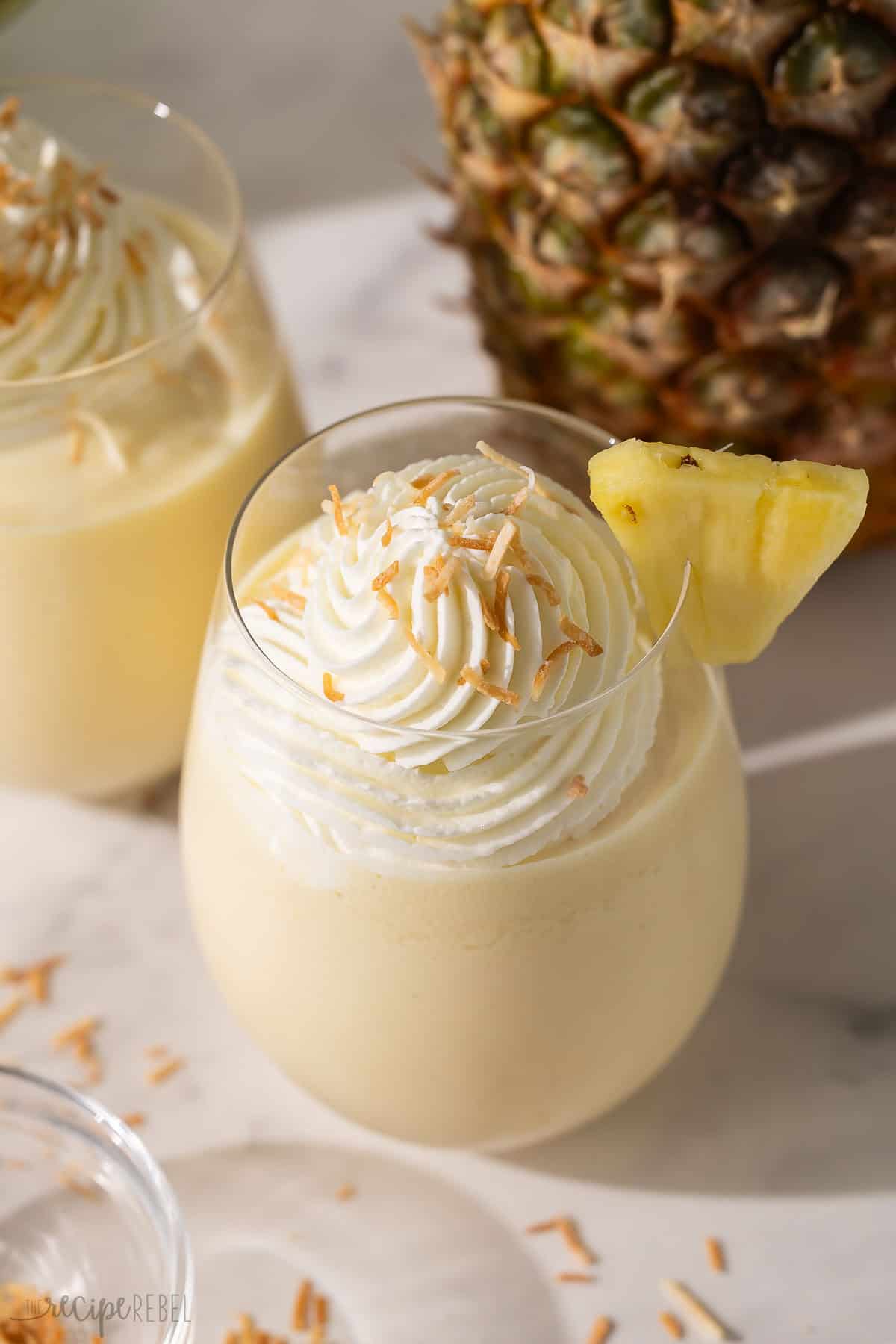 - Pour into glasses and serve with whipped cream and a pineapple slice and toasted coconut if desired.