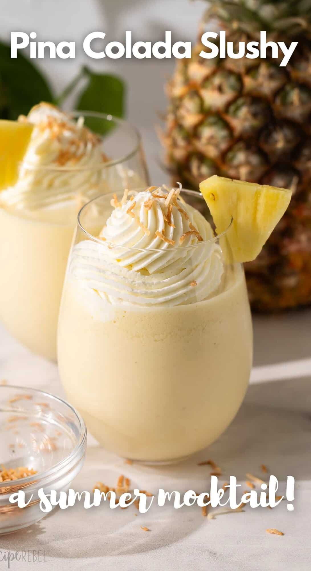 Get a taste of the tropics with this Frozen Pina Colada slushy recipe! It’s made with creamy coconut milk, condensed milk, vanilla, frozen pineapple, and tons of ice for a drink that feels like a beach vacation.
