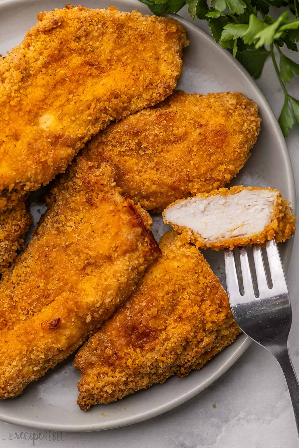 From there, transfer the breaded frozen chicken to freezer bags, and keep for up to 3 months frozen. There’s no need to thaw them before baking, but you will need to add more cooking time (around 2 to 5 additional minutes per side, depending on the thickness of the chicken).